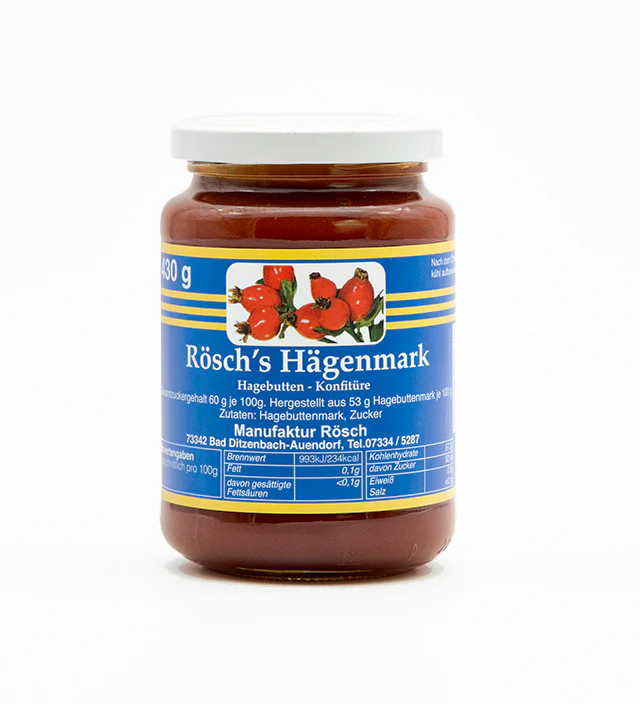 Gesamtzuckergehalt 60g je 100g. Hergestellt aus 53g Hagebuttenmark je 100g